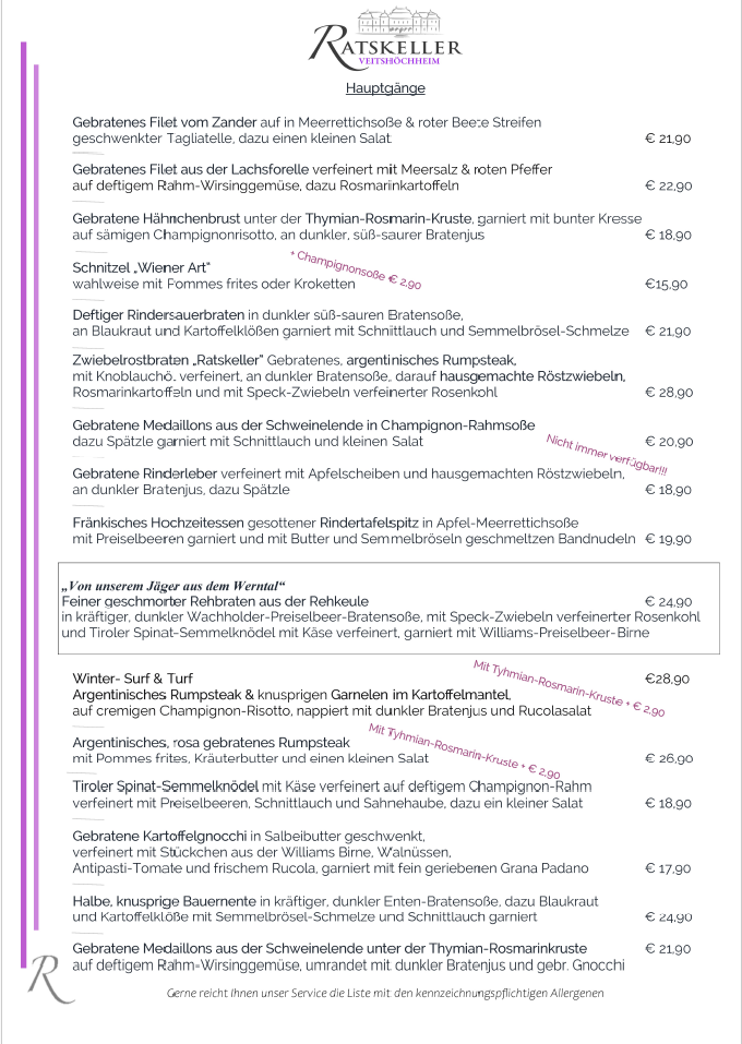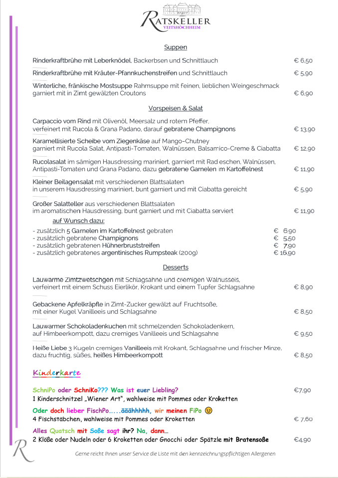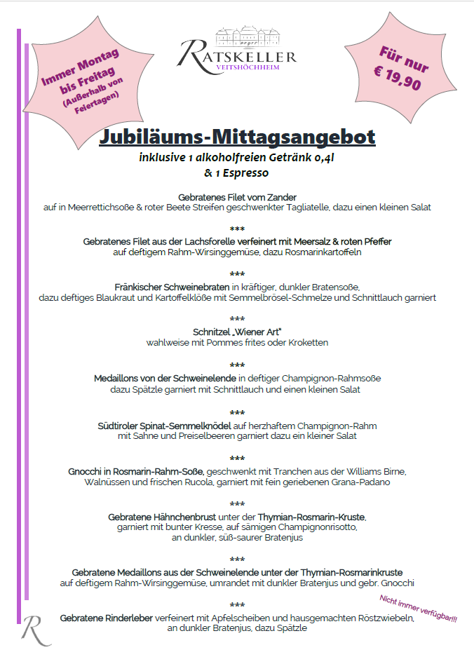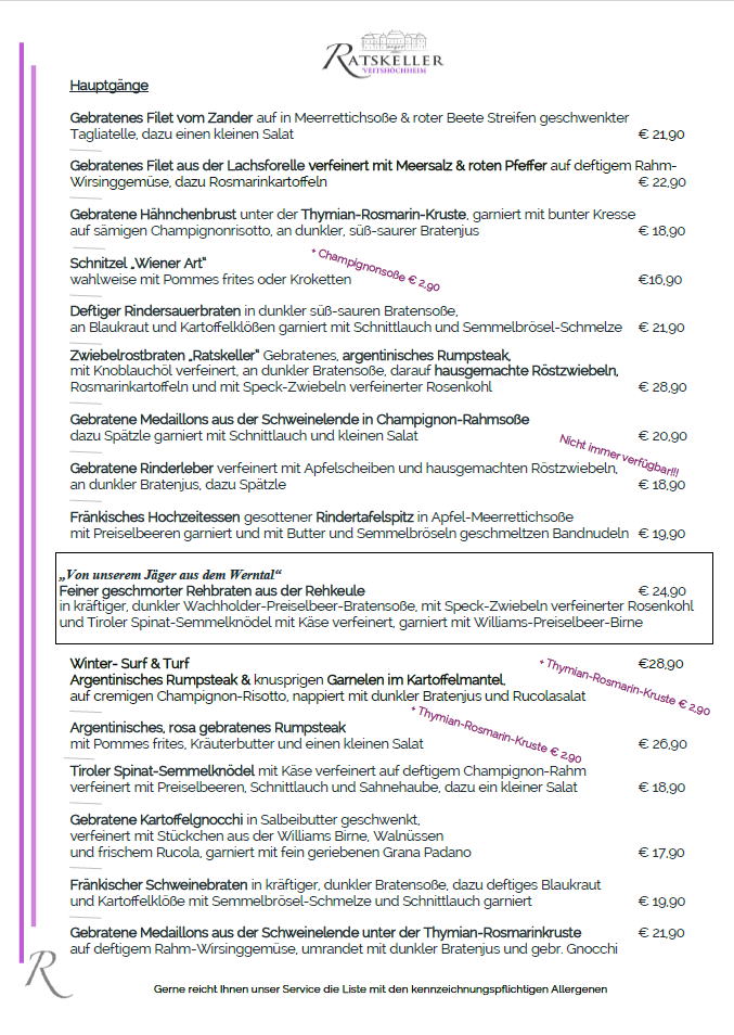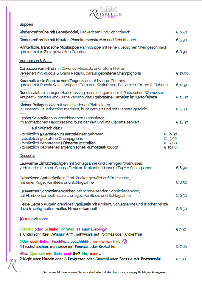 Ehrliches Handwerk, freundlicher, kompetenter Service und ein gutes Preis-Leistungs-Verhältnis ist Herzenssache im Ratskeller Veitshöchheim – überzeugen Sie sich am besten selbst.